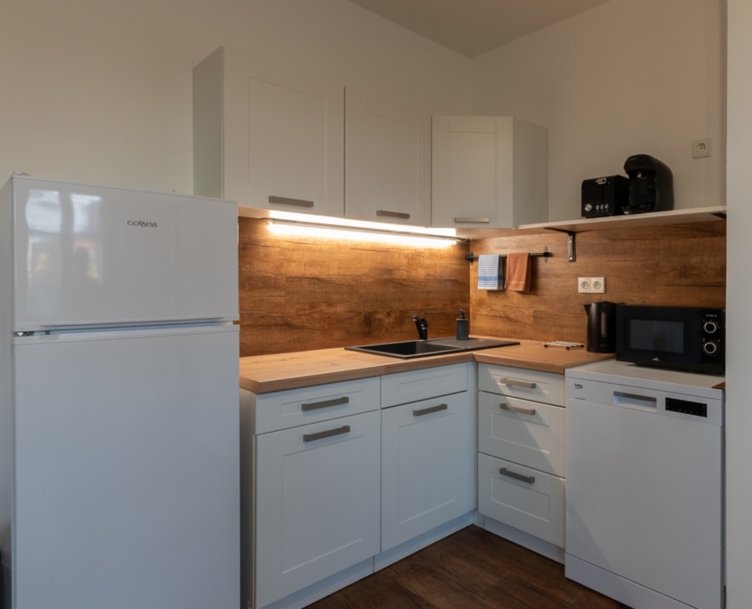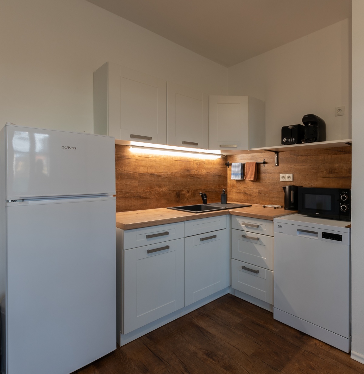 - Lednice, mikrovlná trouba, indukční vařič, kávovar, rychlovarná konvice, topinkovač, myčka